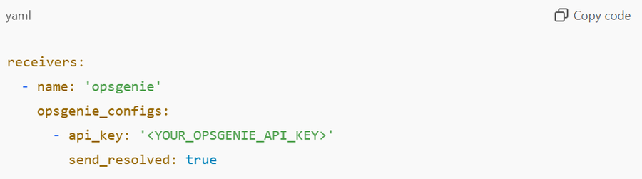 - Configuring prometheus.yml for OpsGenie Integration:Add the OpsGenie integration to Alertmanager’s configuration file: