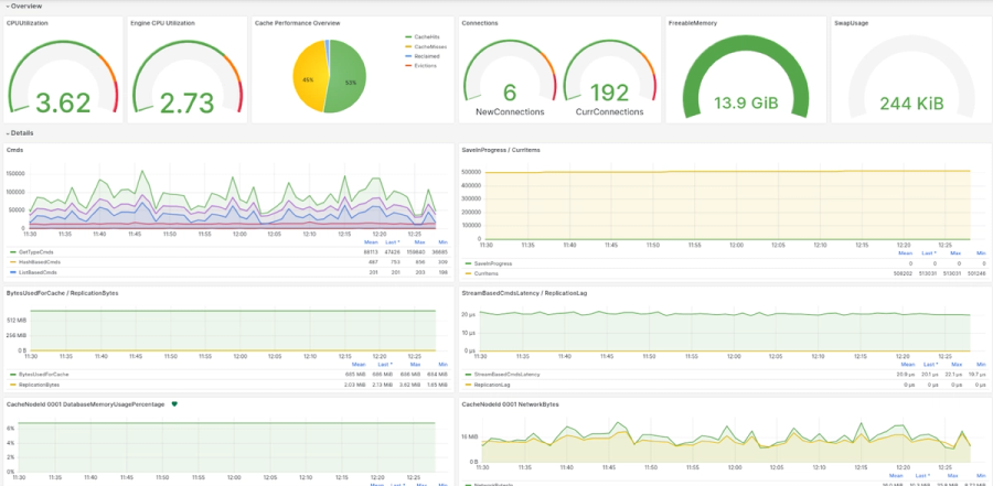 Amazon CloudWatch provides predefined metrics for ElastiCache, making tracking performance indicators like CPU utilization, memory usage, and replication lag easier. You can set up custom dashboards to visualize key metrics and monitor the health of your ElastiCache clusters in real-time. CloudWatch enables automated alerting so your team can respond quickly to performance degradation or resource constraints, ensuring high availability and efficient caching.