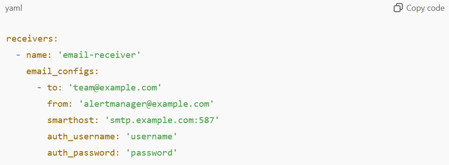 Alertmanager provides flexible options for sending notifications to various platforms, ensuring that alerts reach the right teams promptly. Below are the key notification methods and examples of how to configure them.