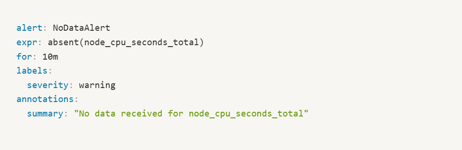 Example configuration for a missing metric alert: