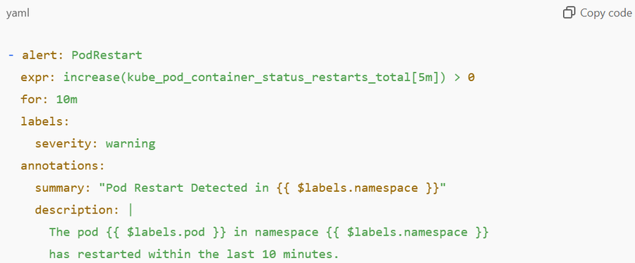 - Use the kube_pod_container_status_restarts_total metric to monitor pod restarts.