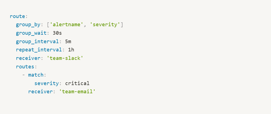 - Routing ensures alerts are delivered to the correct receiver based on predefined rules in alertmanager.yml.