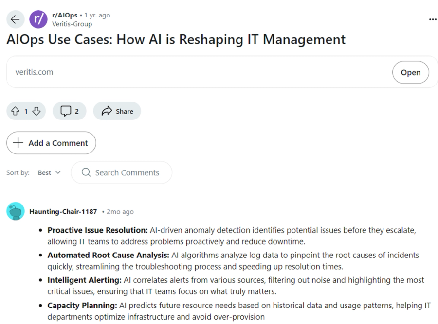 - Proactive Incident Management: Predict and fix issues before they breach SLAs.Root-Cause Analysis (RCA): ML identifies the real culprit, shrinking MTTR.Event Correlation: Duplicate or related alerts are merged into one actionable thread.Capacity Planning: Predictive analytics forecast resource needs.Task Automation: Repetitive, well-defined steps are handed to bots.