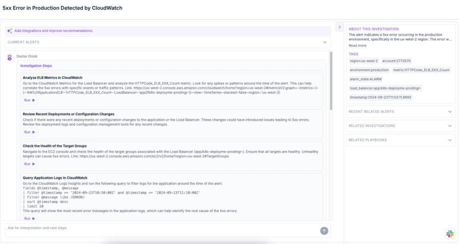 Doctor Droid PlayBooks automates the first level of investigation by gathering relevant logs, metrics, and diagnostic data.