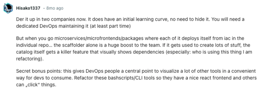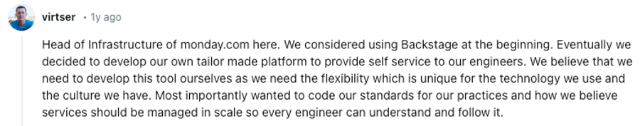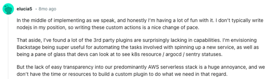 3. Enterprise Functionality Development: Backstage doesn’t provide enterprise functions like SSO and audit logs out of the box. There are some teams that found that it was taking them longer than they planned to develop them and hence, decided to move with an alternate solution.