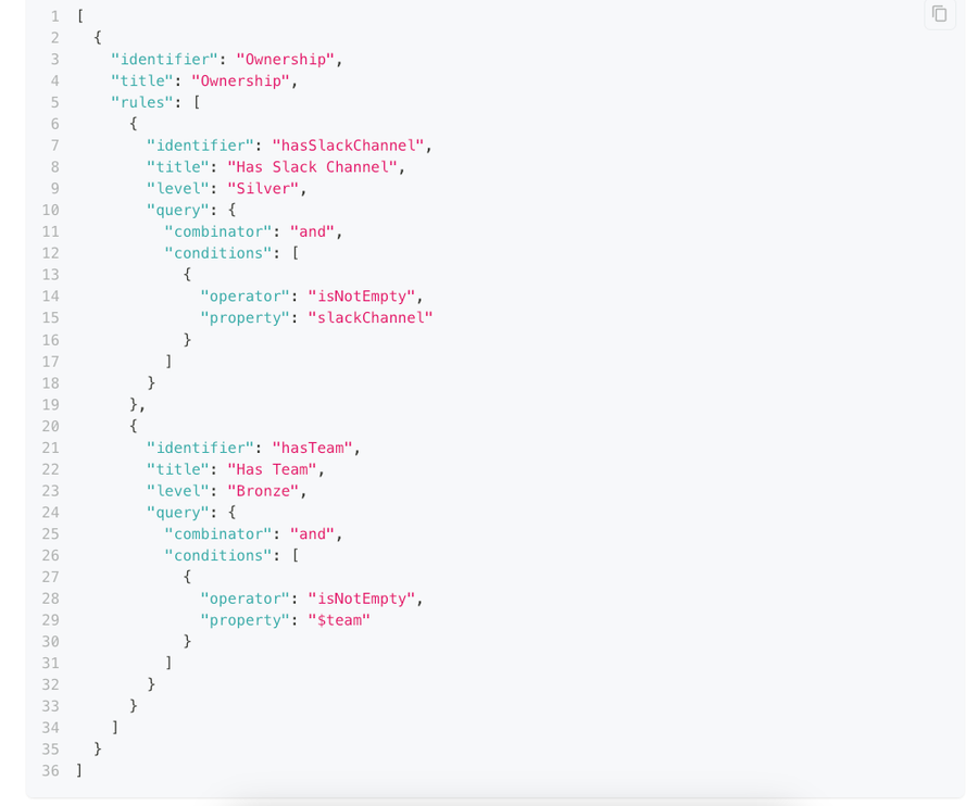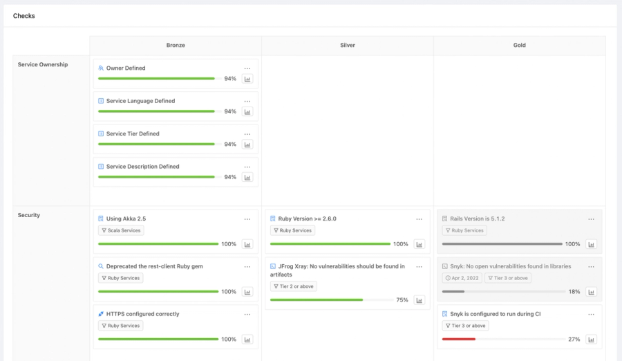Well it absolutely depends on your company and most Service Catalogs enable you to create a “scorecard”. You can create a custom definition of what your team considers a good benchmark by using a combination of DORA metrics, Operational maturity (has alerts configured? has dashboard links?), Health KPIs, security scans, and more.