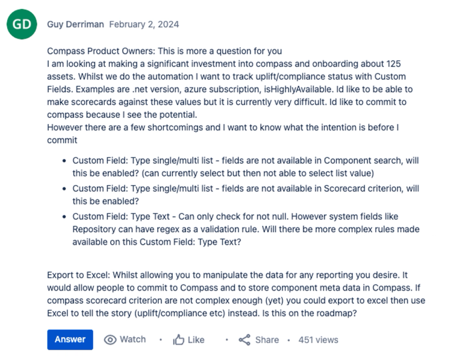 1. Atlassian Compass moved out of beta into general availability on October 17, 2023. Given it’s freshness, it’s scorecard is still maturing and does not have complex actions or checks that are significantly few. (especially w.r.t integrations with Code Analysis & Security tools). Read more about a user checking in the Compass Community about features that it couldn’t find in the tool yet.
