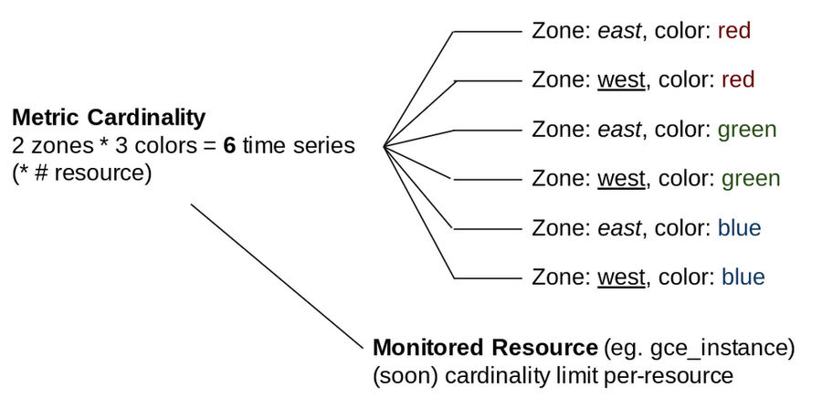 For instance, if a metric descriptor includes labels for zone and color, and there are two distinct values for zone and three distinct values for color, the metric would have a cardinality of six. This is because there are six unique combinations of the label values, as illustrated in the diagram.