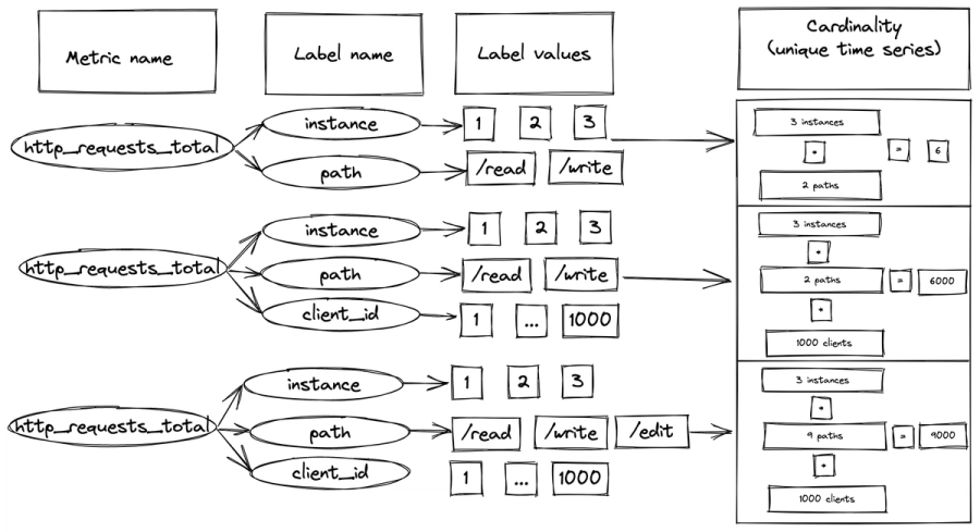 - Exponential Growth in Data Points: Each additional label or dimension multiplies the number of metrics to be processed, stored, and queried.