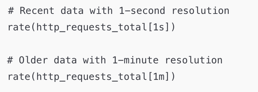 - Downsampling: Lower the resolution of older data to save storage. For instance, retain 1-second granularity for recent data but use 1-minute for older data. Below is an example for Downsampling (using Prometheus query):