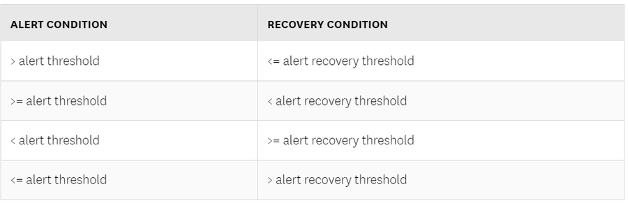 The recovery threshold is met when the defined recovery condition is satisfied, and it varies depending on the alert condition: