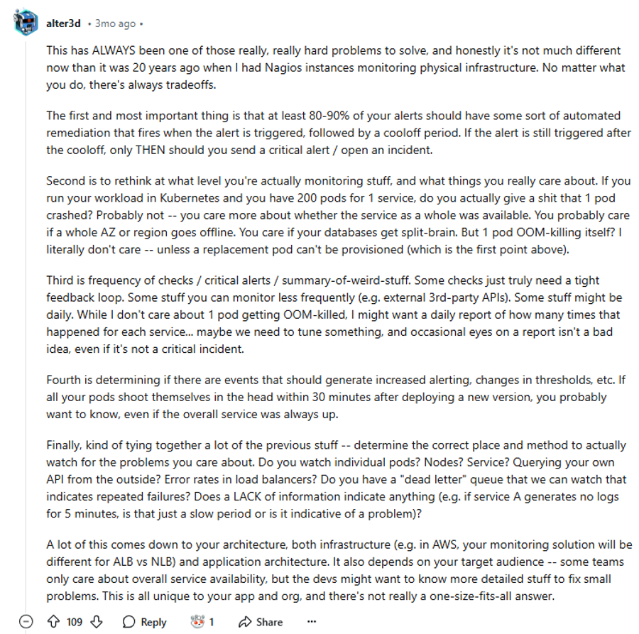 Our friend here reflects on the long-standing challenge of managing alerts effectively, drawing comparisons between past experiences with Nagios monitoring and current practices. He/She has emphasized the importance of automating the remediation process for 80-90% of alerts, with a cool-off period before escalating to critical alerts or opening incidents. The member also advises reassessing the level at which you monitor systems.